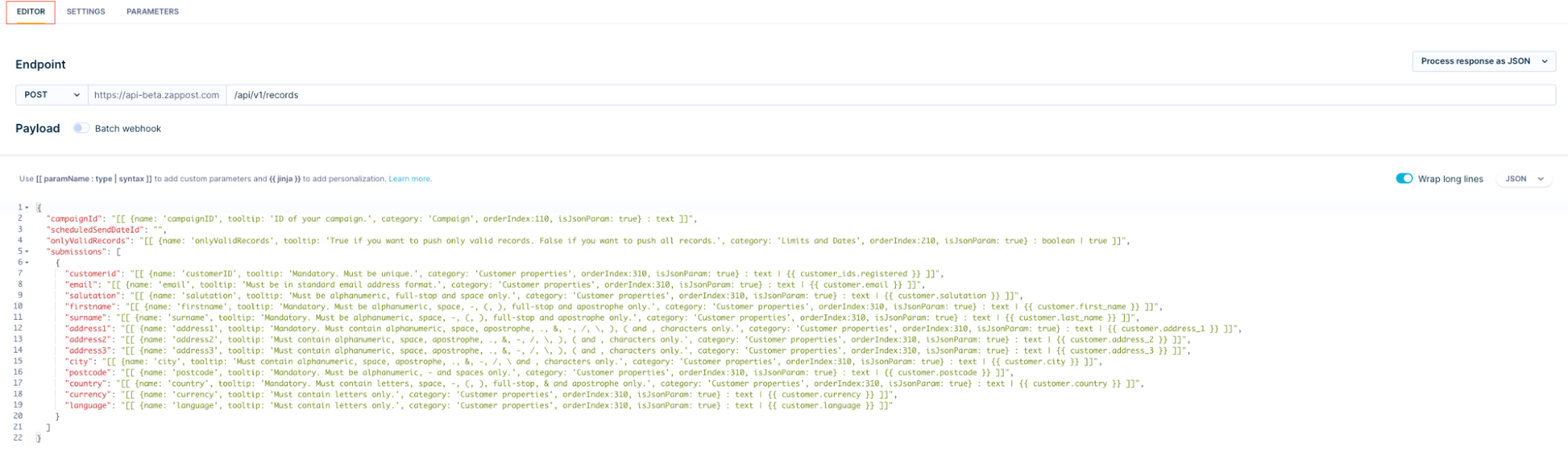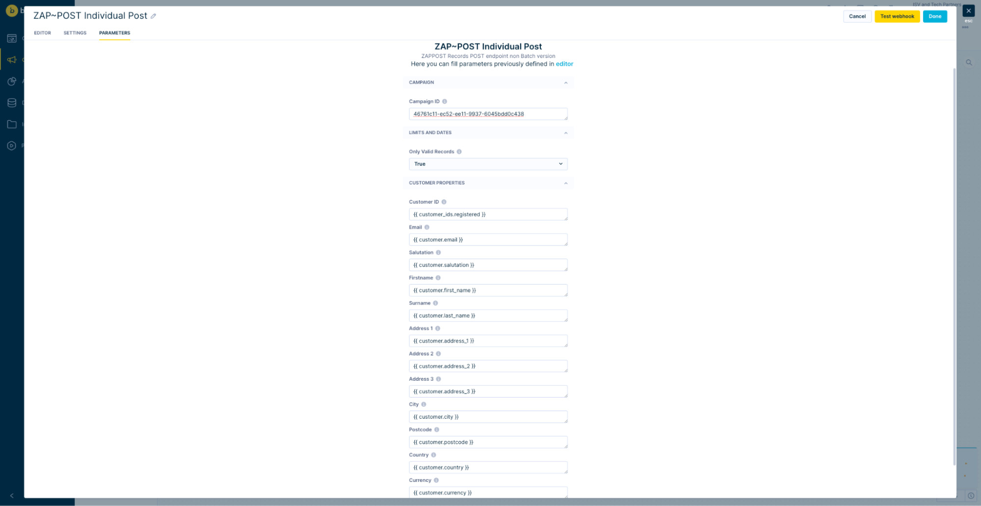 Get the Campaign ID from ZAP~POST The webhook will be sent even with only Campaign ID and will return code 200, which signals success. However, there will be no information sent to the campaign. You need to customize the customer properties category. There are mandatory properties like, for example, Customer ID and not mandatory, for example, Address 3. Read tooltips by hovering with a cursor over the 'i' and refer to the ZAP~POST documentation.