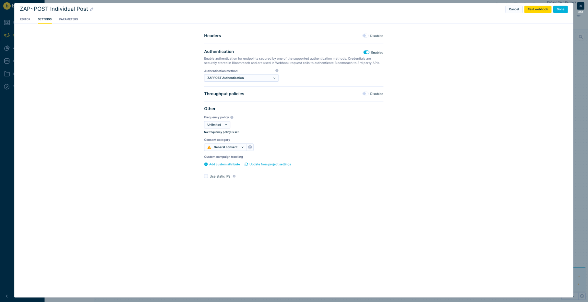 In Bloomreach Engagement, configure the webhook authentication for ZAP~POST so that data can be passed securely in the webhook request. You will use this webhook authentication while creating a scenario in a later step.